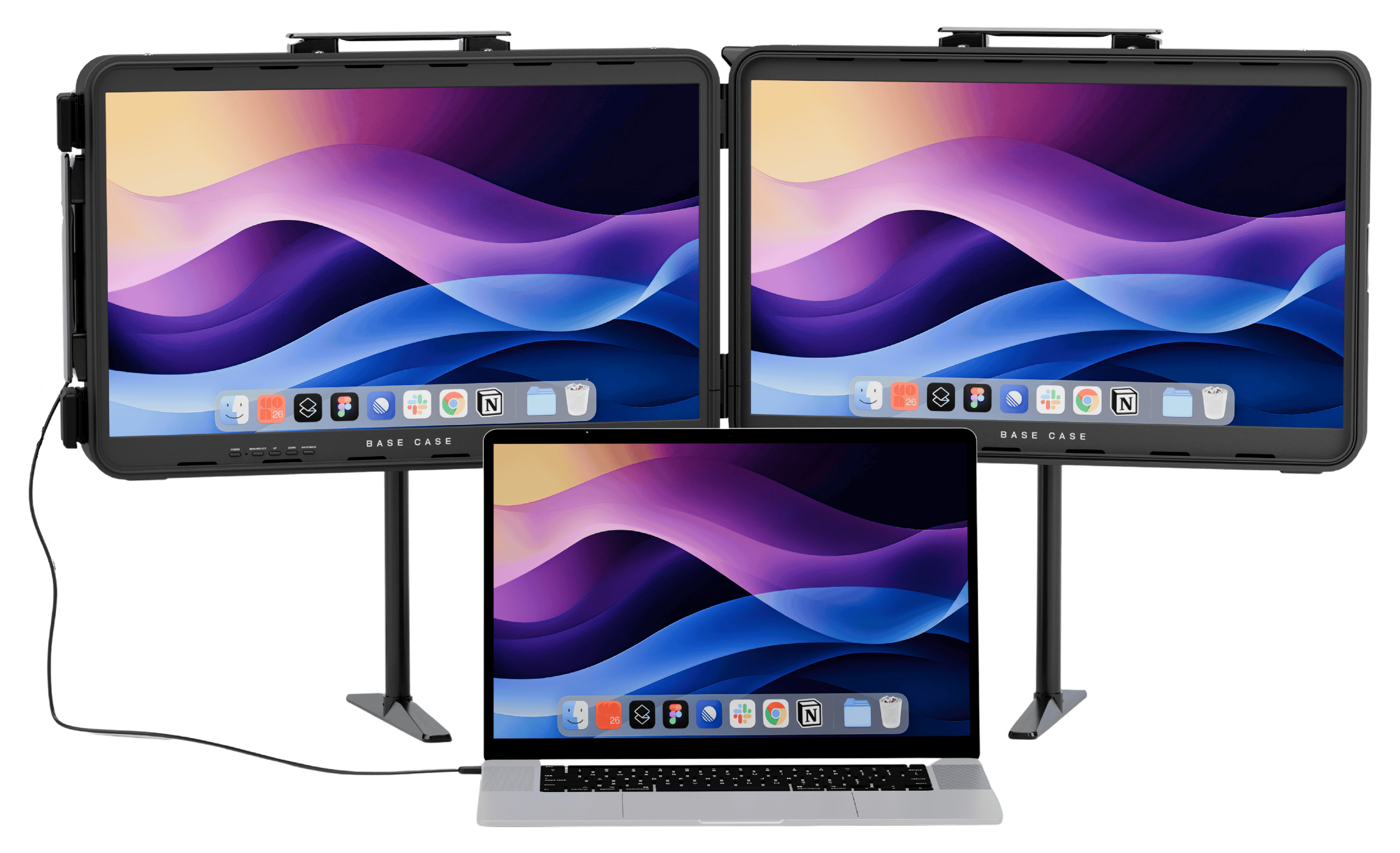 With two 24” Ultra High Definition / 4K displays, a full port panel, integrated telescoping legs, and trolley handle for easy transport, Base Case has everything you need to be ultraportable.